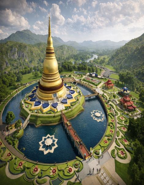 Plantation of a Bodhi tree in front of the main stupa, Surrounding water bodies with mandala-style landscape planning, Chaitya halls, Viharas, meditation center, and library facilities, Vision to develop it as an international Buddhist tourism hub.